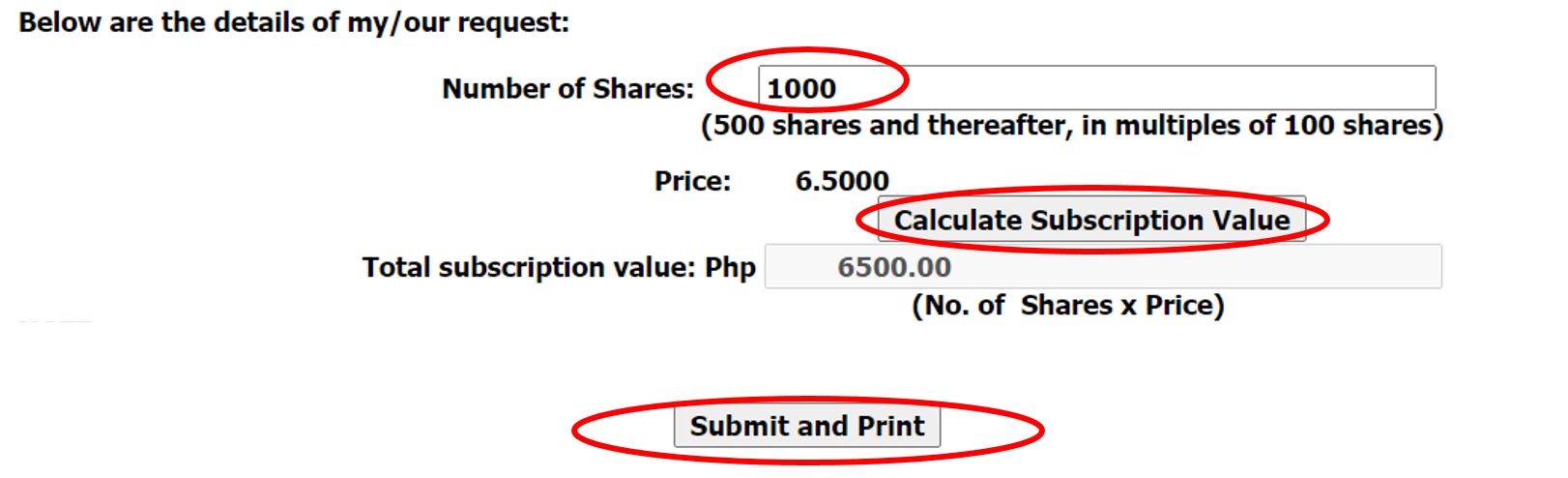 5. Enter the NUMBER OF SHARES you wish to subscribe to, click the CALCULATE SUBSCRIPTION VALUE then click the SUBMIT AND PRINT button