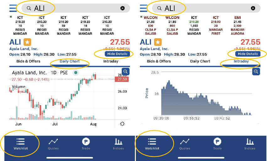 Enter a stock code on the search bar and click the SHOW DETAILS button. Just click on the Daily Chart or the Instraday header to view the corresponding chart.