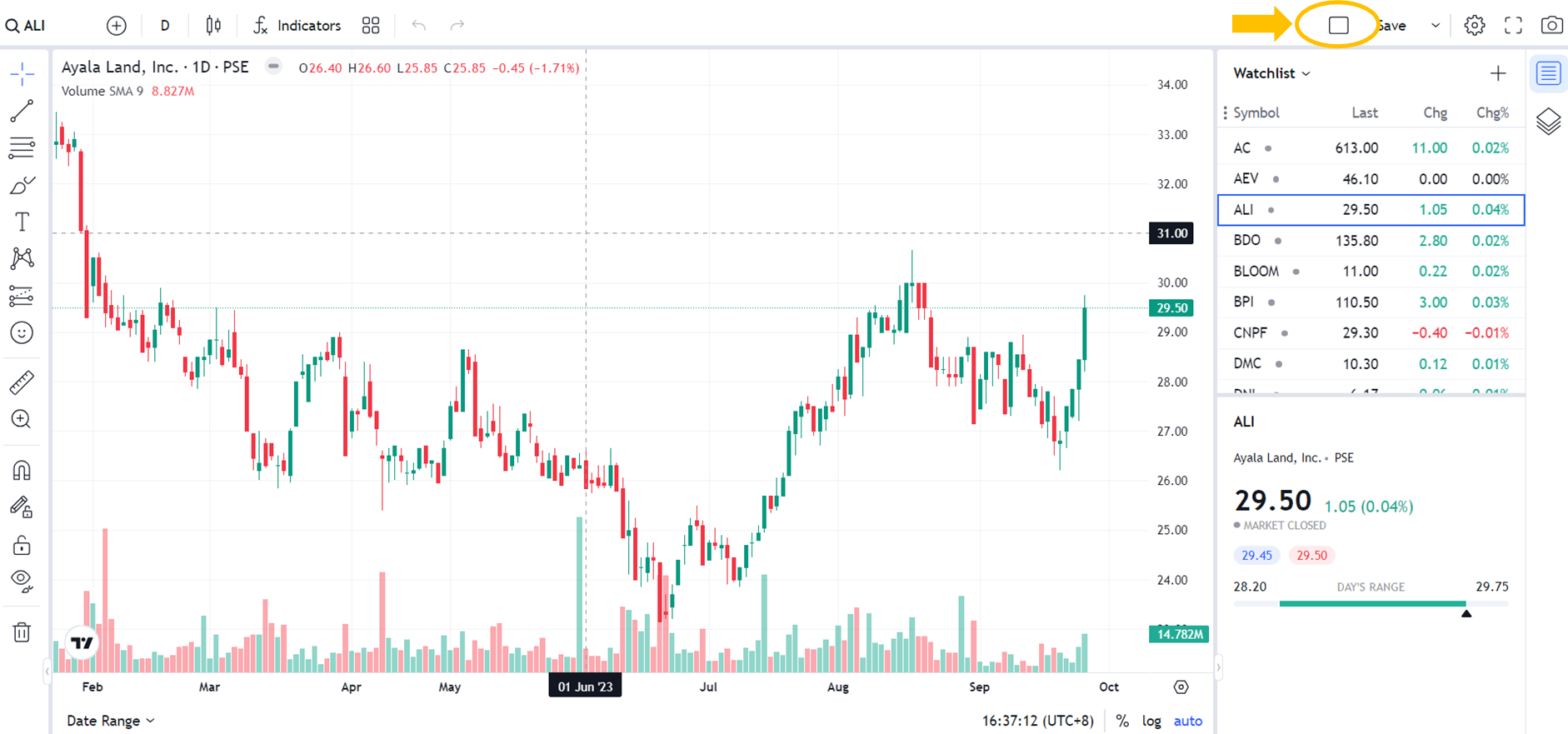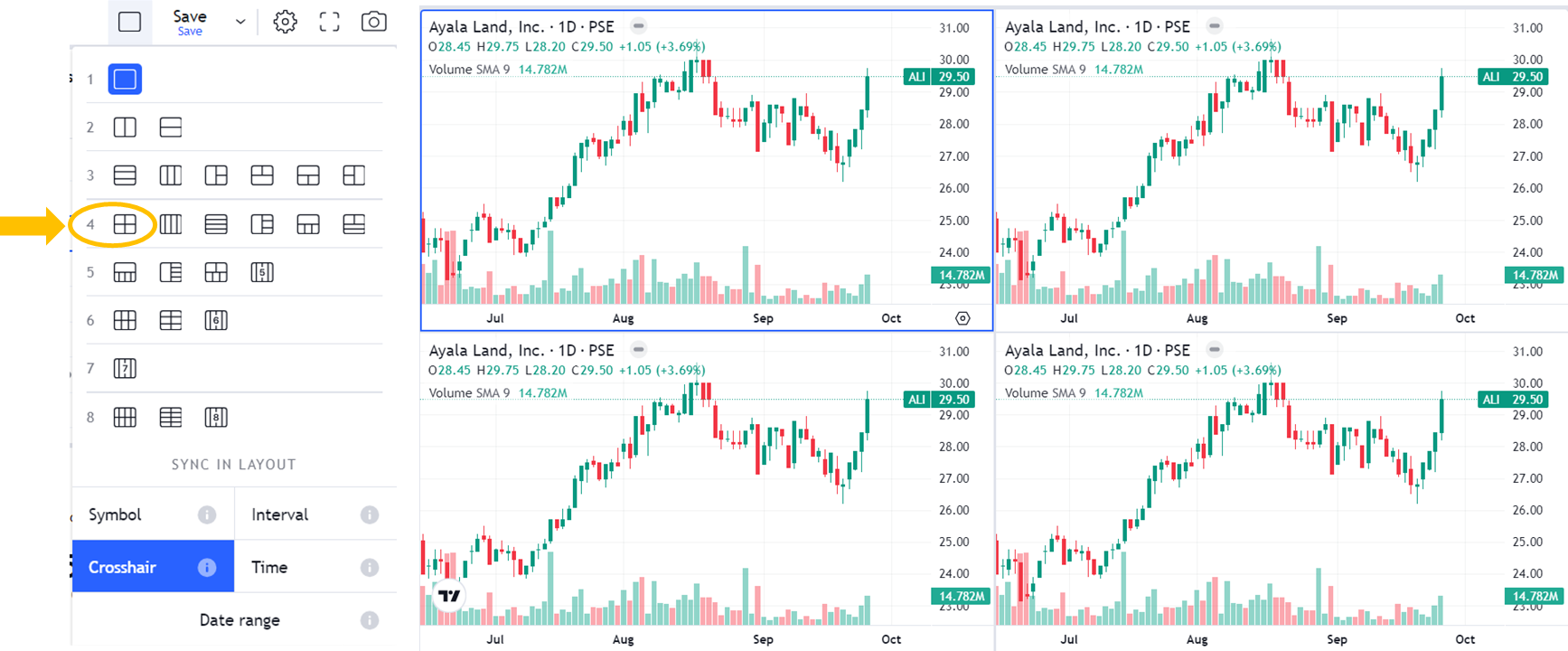 - To change the stocks on each panel, click a panel to highlight it and choose a stock on your watchlist to change it or enter a new stock code on the search bar on the upper left corner of the charting tool