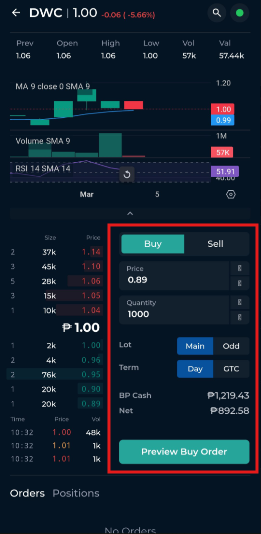 Tap the Buy or Sell button at the lower portion of the screen.