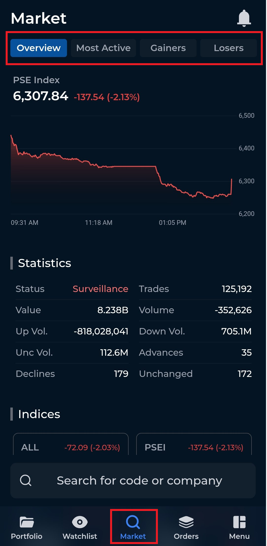 Under the Overview section, you will be able to view the market’s charting, statistics, and indices, including the PSEi and its current performance.